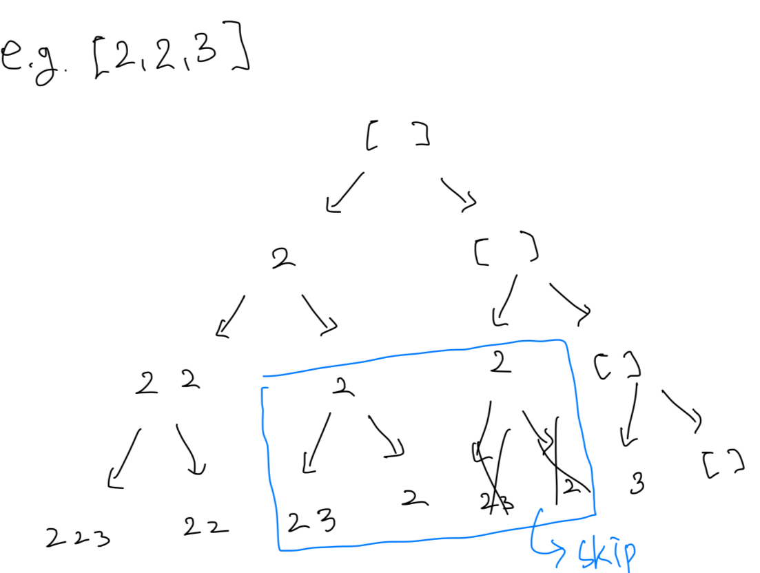 즉, 0번째 요소 2에서 만들어지는 [2, 3], [2]는 1번째 요소 2로 만들어지는 [2, 3], [2]와 중복되는 문제가 발생한다.